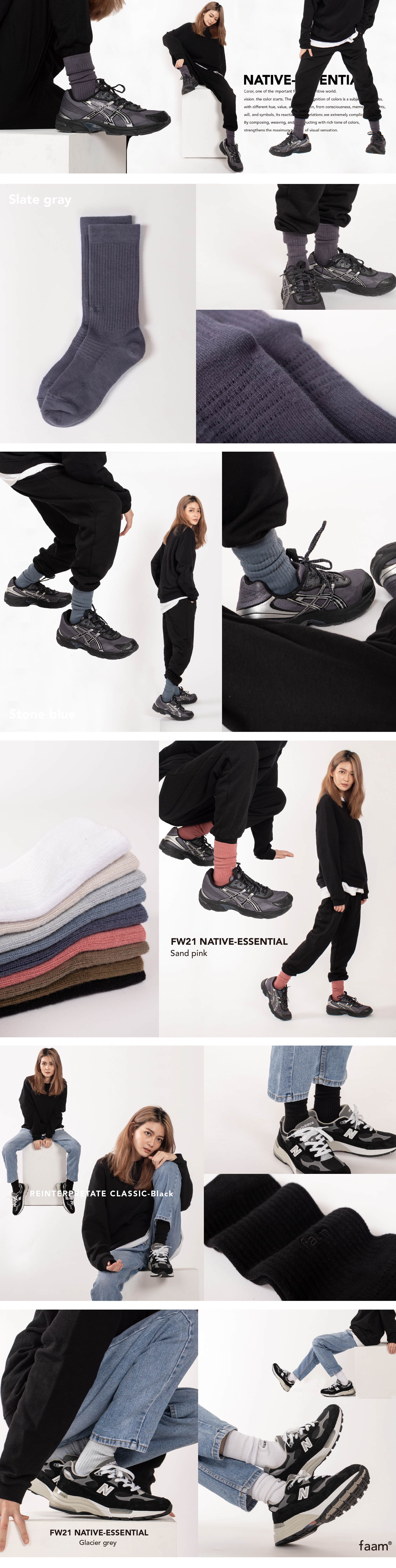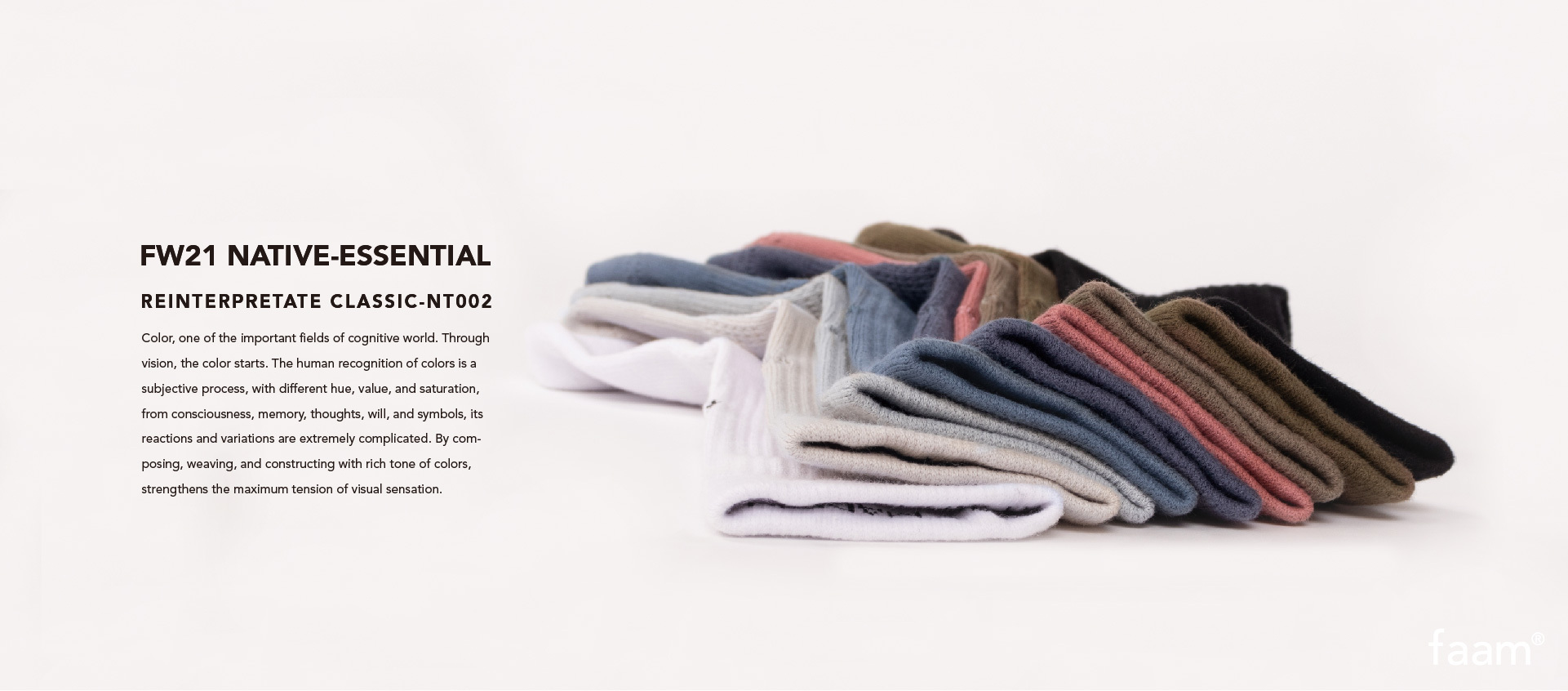 faam致力探索色彩與織物之間的可能性,將秋冬彩色糅合灰階色系,透過凹凸的織物結構,以平衡和諧的視覺溫度詮釋品牌標誌性的簡約主調,加入抗菌、Lycra®提供足下日常生活所需的機能。