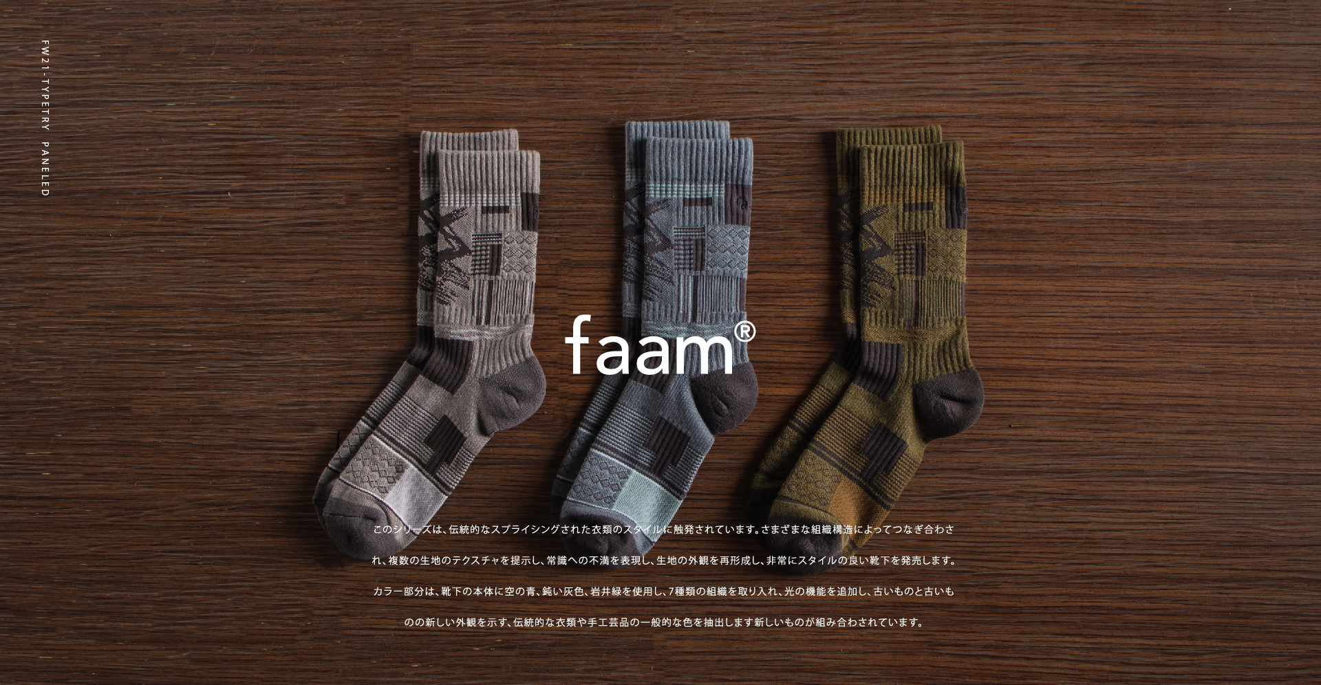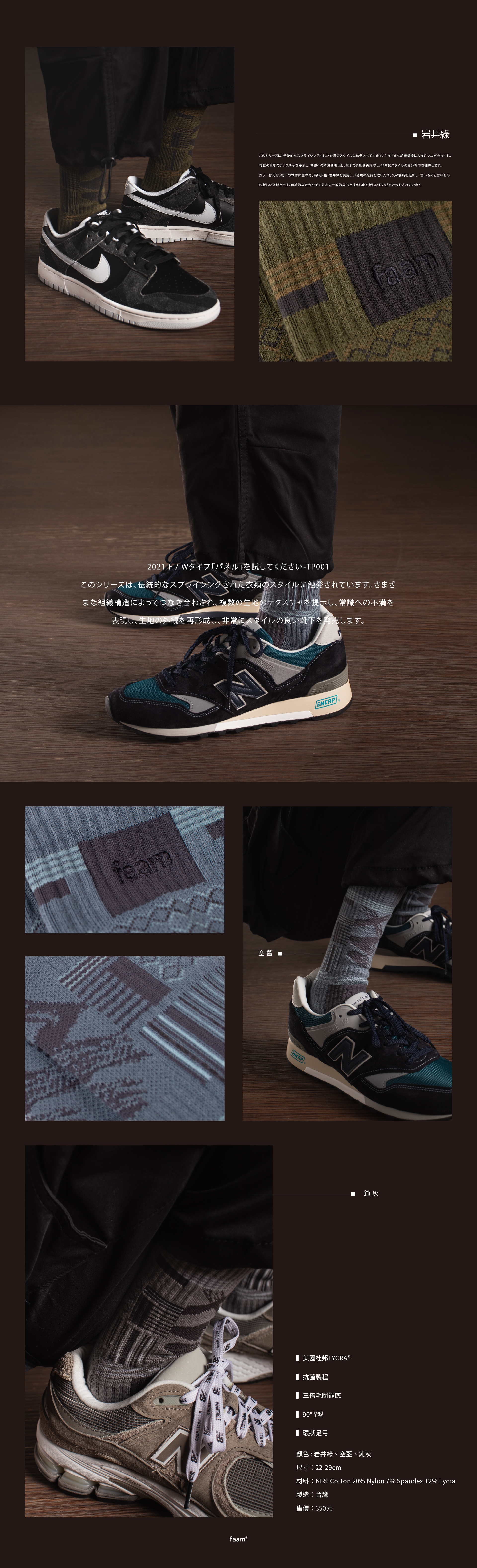 顏色部分擷取傳統服飾、工藝品常見色系,由空藍、鈍灰、岩井綠作為襪身本體,融入七種組織,加入輕度機能,展現新舊共組後的新樣貌。